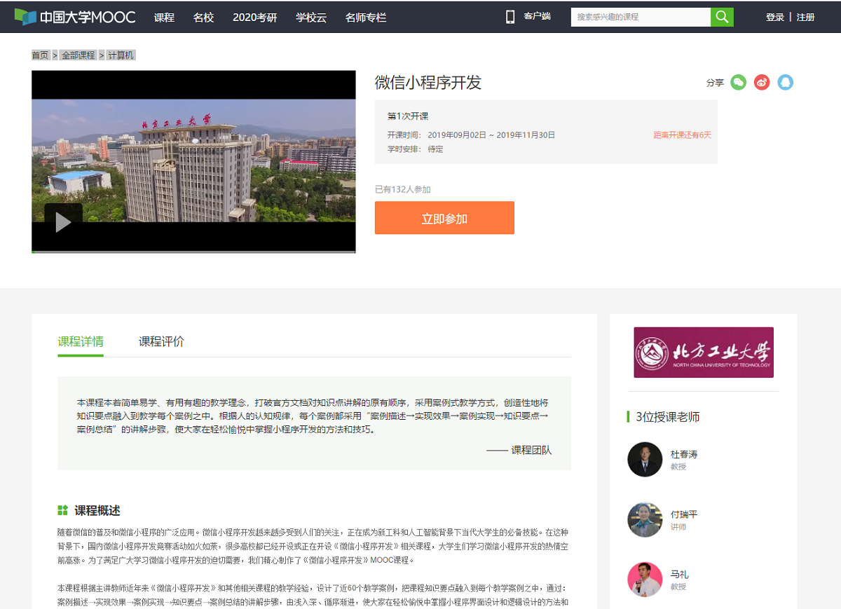 8月26日,由信息学院杜春涛老师、付瑞平等老师负责的《微信小程序开发》课程在“中国大学MOOC”平台成功上线,课程将于2019年9月2日正式开课。这是目前为止在国内主流MOOC平台(爱课程、学堂在线、智慧树等)上线的第3门与微信小程序开发相关的MOOC课程。该课程采用案例式教学方式,共设计了59个教学案例,每个案例都采用“案例描述→实现效果→案例实现→知识要点→案例总结”的步骤,系统阐述了微信小程序开发的方法和技巧,...