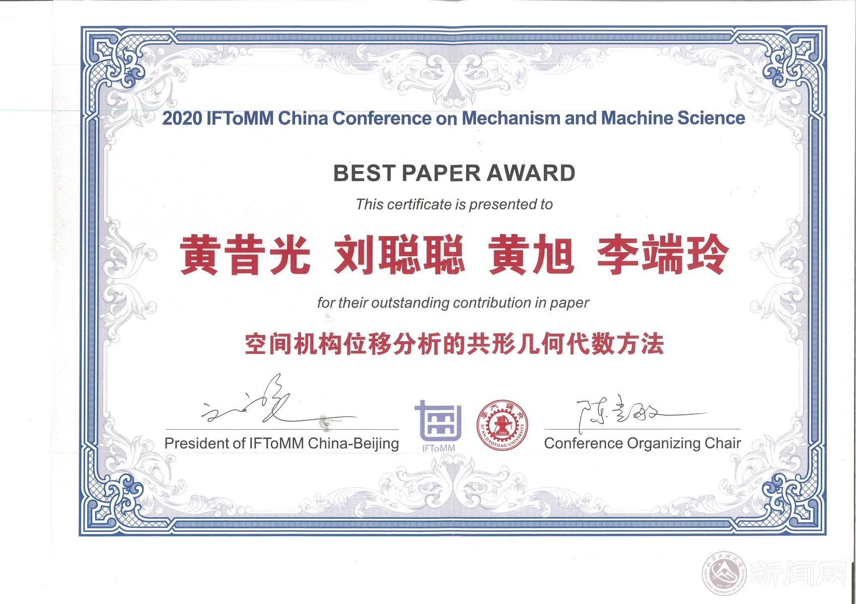 9月25日-27日,第22届中国机构与机器科学会议(CCMMS 2020)在古都西安召开。机械与材料工程学院教师黄昔光作为第一作者与通讯作者的论文《空间机构位移分析的共形几何代数方法》获得大会颁发的最佳论文奖(Best Paper Award)。