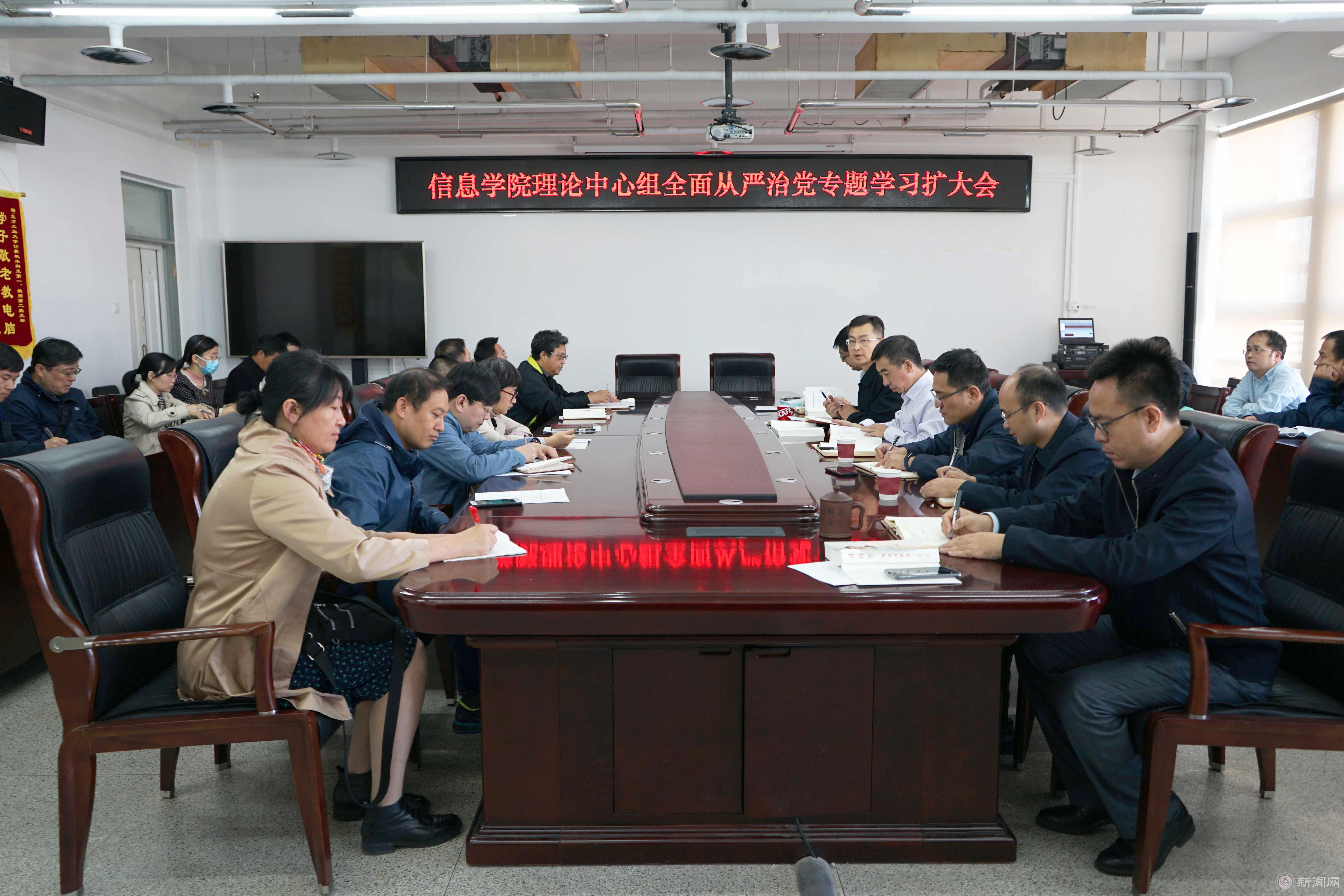 10月12日,信息学院党委理论学习中心组成员在瀚学楼1014会议室召开学院理论中心组集体学习(扩大)会,专题学习《习近平谈治国理政》第三卷第19专题“不忘初心、牢记使命,把党的自我革命推向深入”中关于“全面从严治党”的系列文章。学校党委理论学习中心组巡听工作小组成员列席会议。会议由学院党委书记王月海主持。